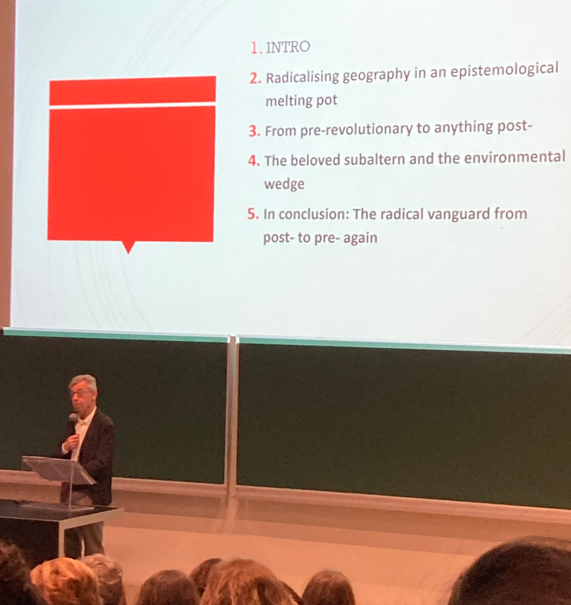 The programme for the conference included 90 parallel sessions, 400 presentations and, based on the many sessions attended, a healthy representation of Geography’s many sub-disciplines. Erik Swyngedouw, issuing the inaugural keynote address, provided a sweeping history of human geography, in a presentation aptly titled, Meandering Across Time and Space: A Geographical Expedition Through a Reactionary Discipline. What Swyngedouw covered was profound and too challenging to summarise in this blog post, but in his response to the prompt on the role of Geography in the past, present and future, Swyngedouw pointedly called out the need to break from intellectual dishonesty, to recognise that we are the architects of populist discourse and that we need to  name key mechanisms of struggle and speak truth to them. Importantly, he claimed, we need to specify our geographical desire and mobilise our intellect towards it, speaking truth to power in the process.