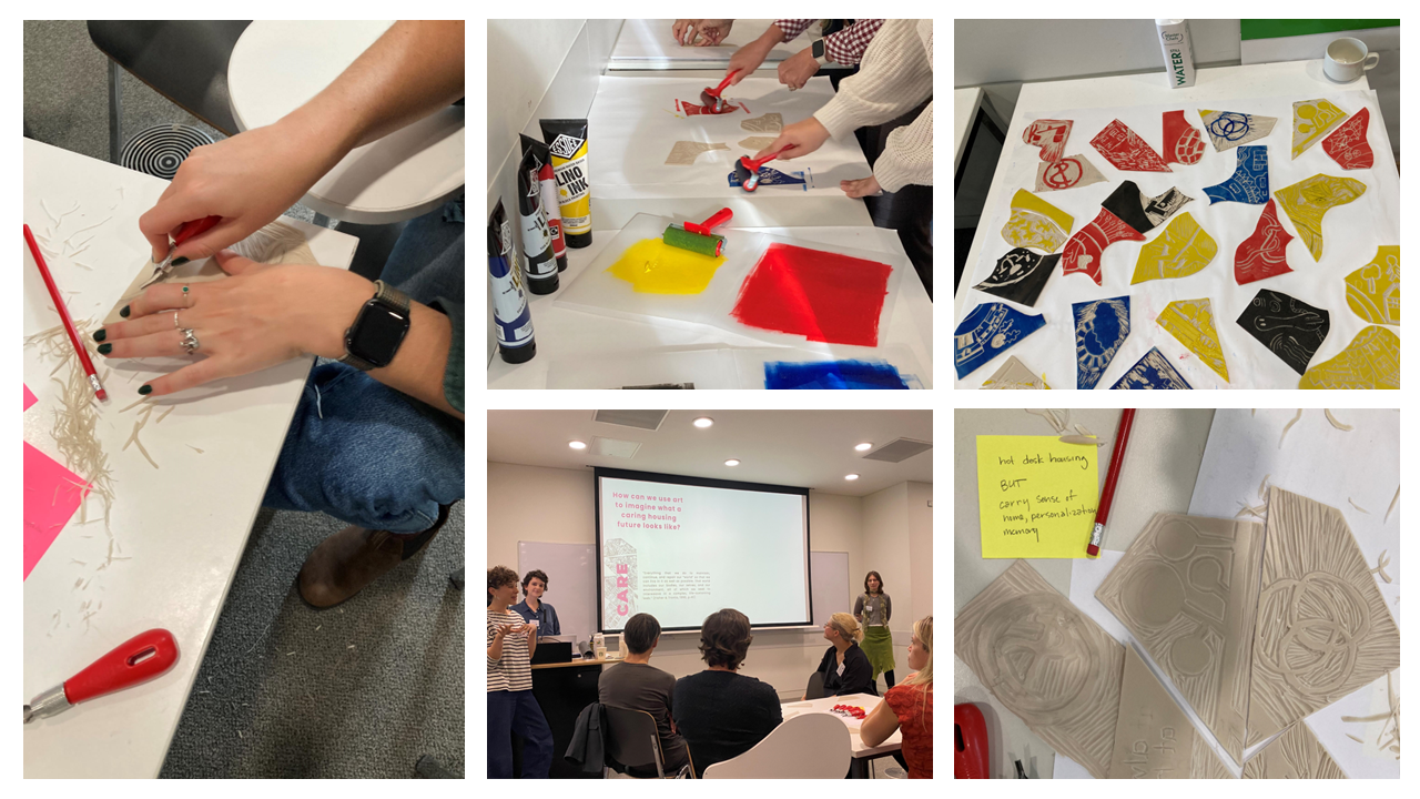 Two workshops, one held on each day, were scheduled to allow workshop facilitators to demonstrate the use of arts-based methods in action. The first, facilitated by Agata Gunkova, Madeline Isobel Mesich and Margareta Relijić focused on imagined housing futures. Participants were asked to individually reflect and write down what it meant to integrate care into housing. Split into small groups, participants discussed what a caring housing could look like. Following the discussion, individuals were given a piece of lino and carving tools to sketch and carve a caring housing utopia. Each of the pieces that the small groups used connected like puzzle pieces to a create a whole. Participants then painted their pieces and stamped them into connected wholes on poster board. The produced outcomes were used to further the discussion on alternative housing futures.