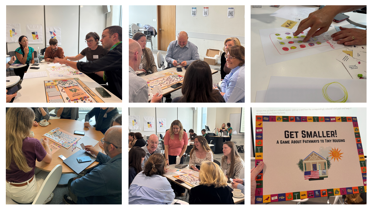 The second workshop was facilitated by Ella Harris and Mel Nowicki based on previous research on the use of tiny homes in Austin, Texas. The research project led to a Tiny House Boardgame, which Ella and Mel introduced to the group through game play. Players navigated the board as characters, derived from Ella and Mel’s research. Each player had a fixed budget and chance cards that reflected housing experiences and/or setbacks. At the end of the game, players could ‘see’ their tiny housing reality based on the journeys they took, and the material possessions picked up along the way. The latter half of the workshop kept the theme of game play. Participants were given a short amount of time to develop a game based on housing. The game design that each table created was later shared with the group. The experience of creating a game helped participants reflect on the usefulness of games as a research tool.